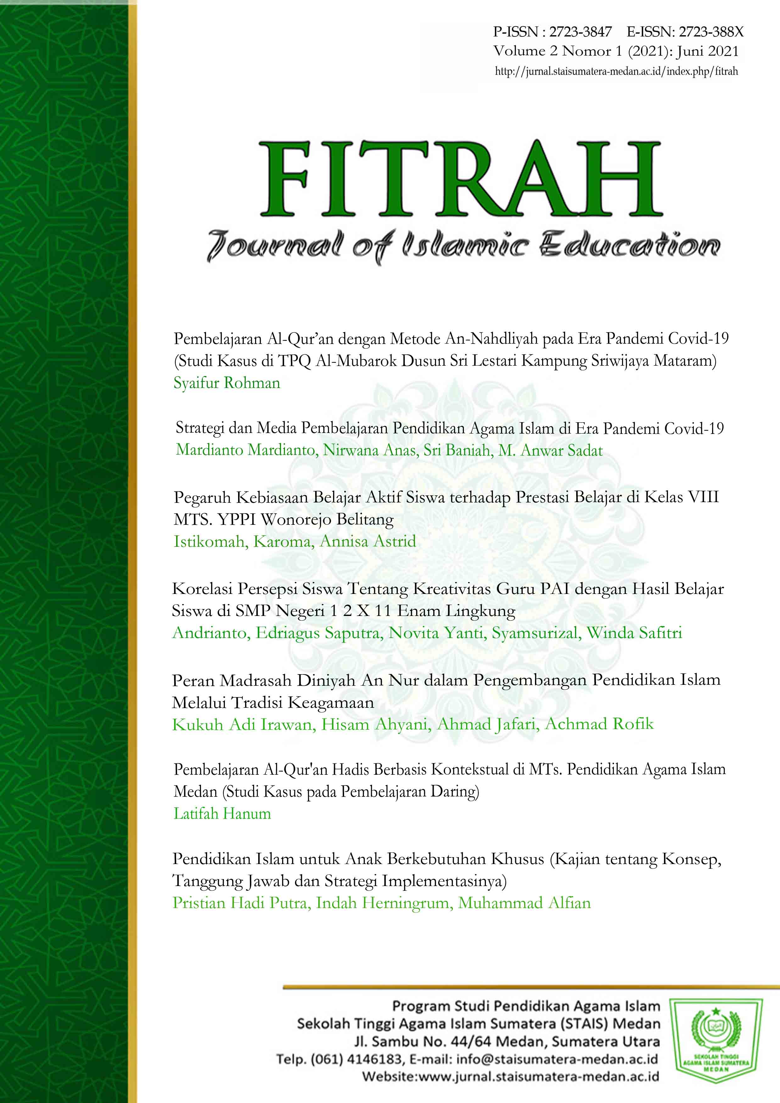 Vol. 2 No. 1 (2021)Fitrah: Journal of Islamic Education: Published twice a year, in January-June and July-December. Volume 2 No. 1 (2021) is the first edition of 2021 to be published in print and online. In this edition there are 7 articles by authors from various affiliations, provinces and outside the province. In this edition, articles are presented in the field of Islamic Education with current issues both related to learning activities, teachers, students and educational institutions. The selection of the 7 articles went through transparent and selective stages by editors and reviewers who are experts in their fields, through a peer-reviewer system that complies with management standards.