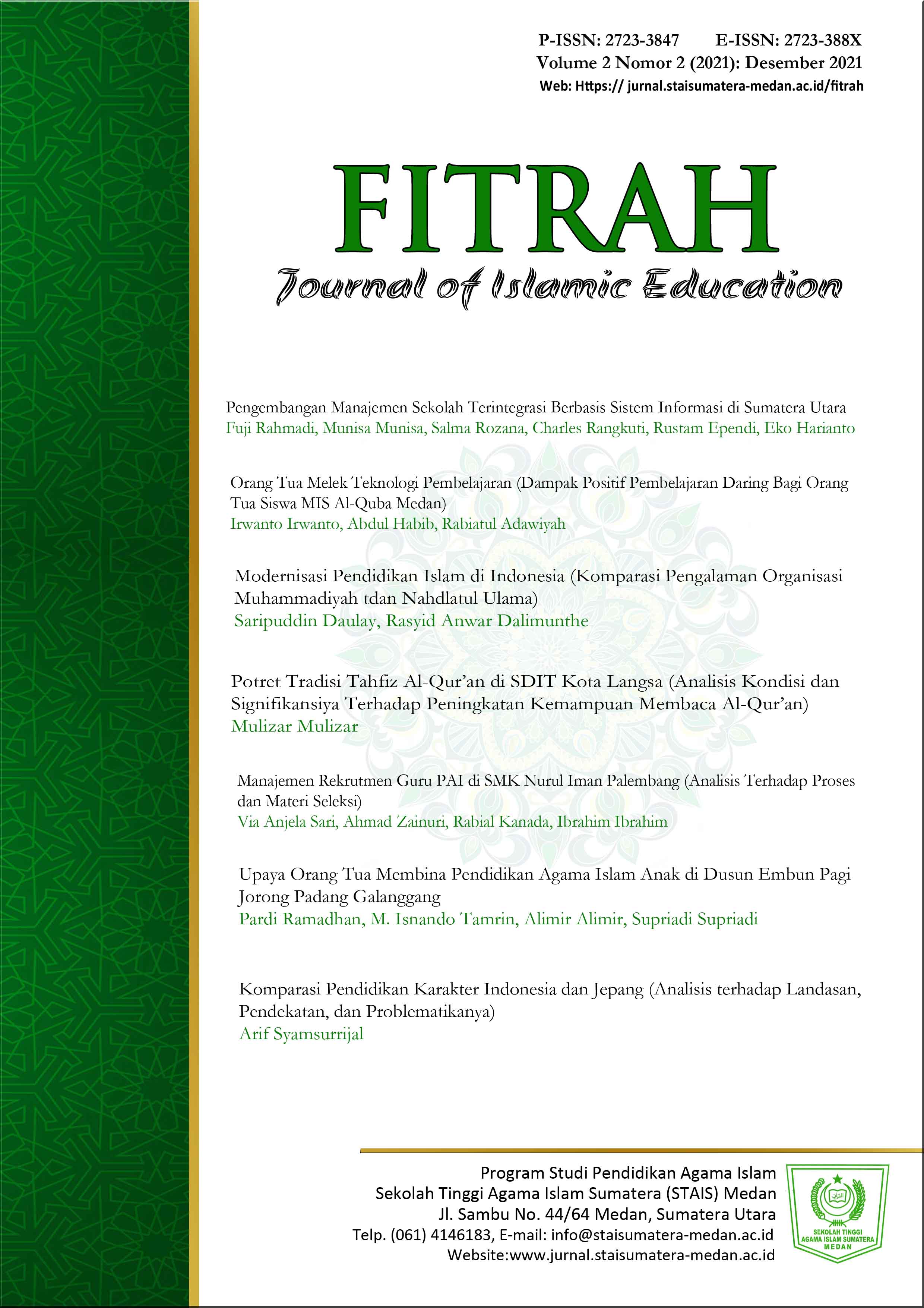 Vol. 2 No. 2 (2021)Fitrah: Journal of Islamic Education: Published twice a year, in January-June and July-December. Volume 2 No. 2 (2021) December 2021 is the Second edition of 2021 to be published in print and online. In this edition there are 7 articles by authors from various affiliations, provinces and outside the province. In this edition, articles presented in the field of Islamic Education with current issues both related to the modernization of education, educational institutions, parents and education, as well as comparative education. The selection of the 7 articles went through transparent and selective stages by editors and reviewers who are experts in their fields, through a peer-reviewer system that complies with management standards.